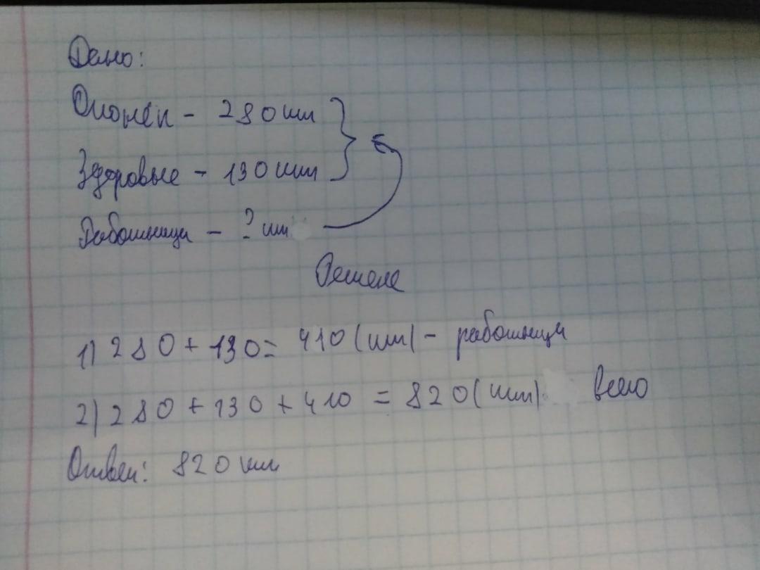 Пошаговое объяснение:1)280+130=410(ж.) 2)280+130+410=820(Ж.)