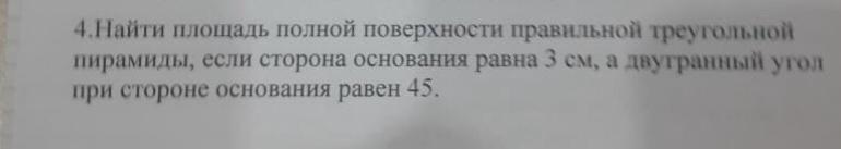 Найти площадь полной поверхности правильной треугольной пирамиды если сторона основания основания равна 3см, а двугранный угол при стороне основания равен 45