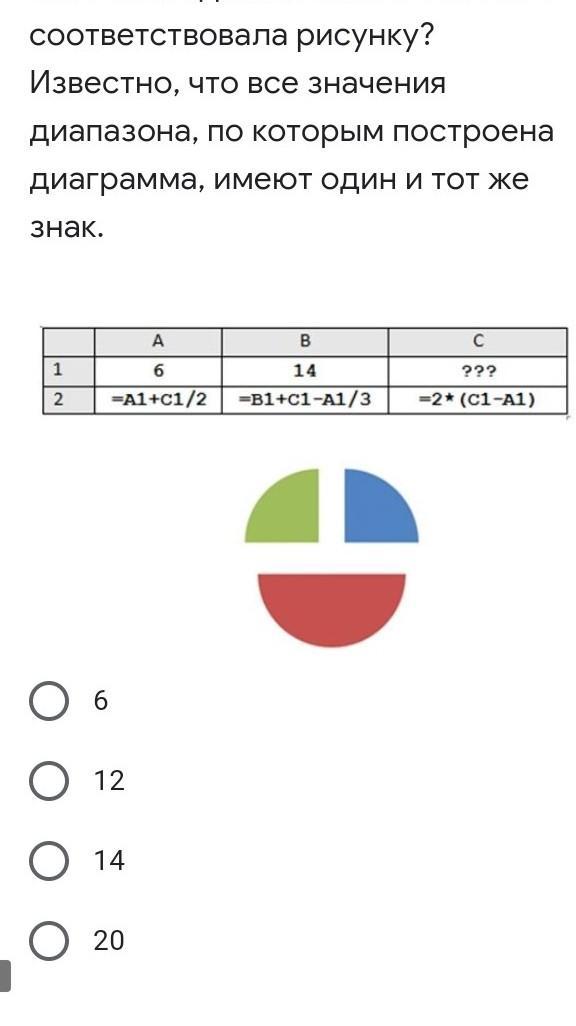 Васе дан фрагмент электронной таблицы. Какое целое число должно быть записано в ячейке C1, чтобы построенная после выполнения вычислений диаграмма по значениям диапазона ячеек A2:С2 соответствовала рисунку? Известно, что все значения диапазона, по которым построена диаграмма, имеют один и тот же знак.