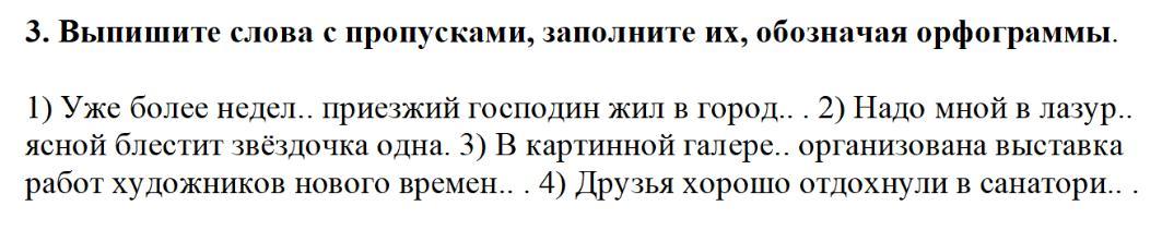 1) Уже более недели приезжий господин жил в городе. 2)Надо мной в лазуре ясной блестит звёздочка одна. 3) В картинной галереи организована выставка работ художников нового времени. 4) Друзя хорошо отдахнули в санаторие