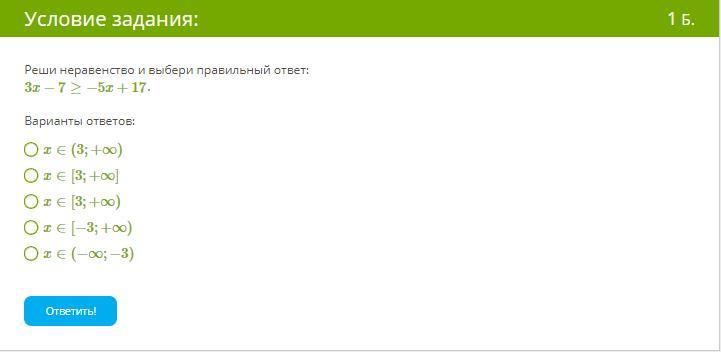 Ответ: в первом второй ответ [3; + бесконечность). Во втором первый ответ (-бесконечность; 3) и (3; +бесконечность)