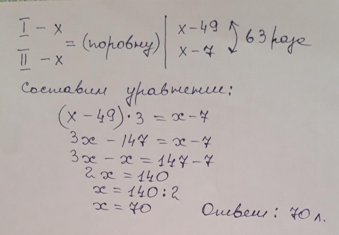 . В двух цистернах было поровну воды. Когда из первой цистерны взяли 49 л воды, а из второй - 7 л, то в первой цистерне осталось в 3 раза меньше воды, чем во второй. Сколько литров воды было в каждой цистерне вначале?