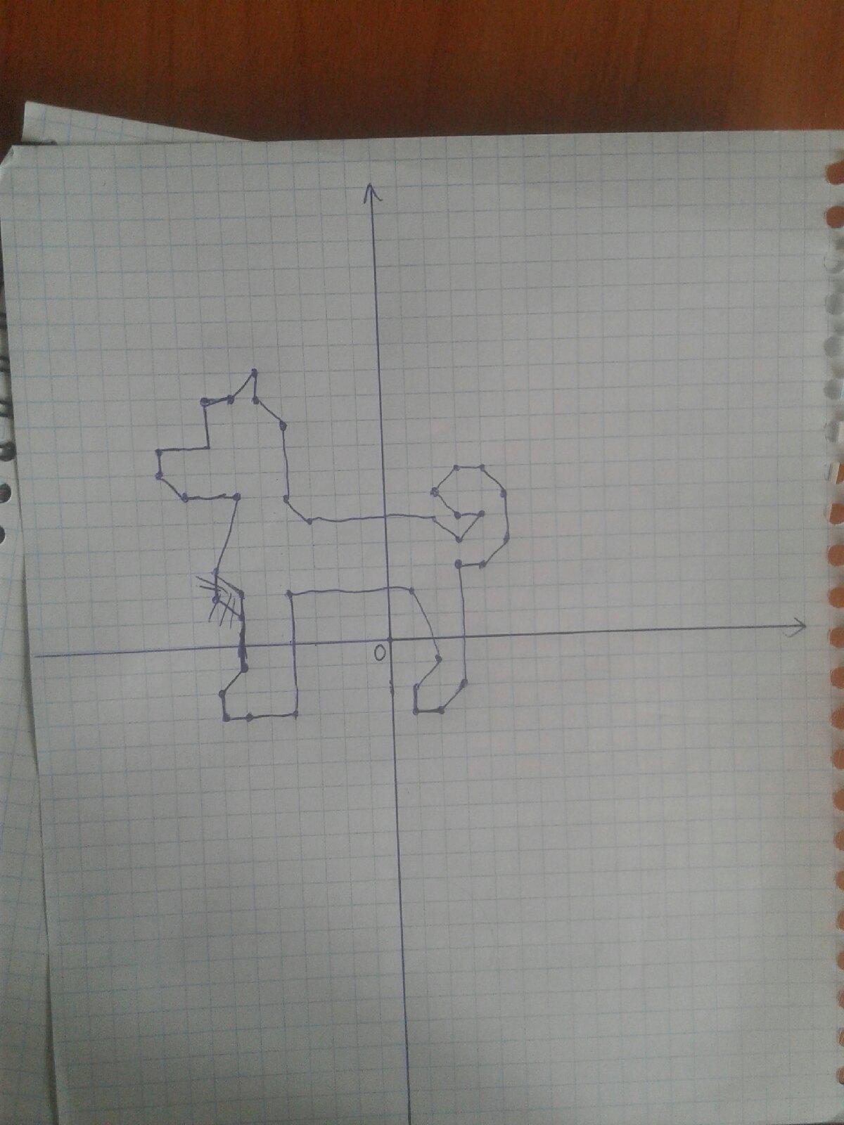 Собака (1;-3), (2;-3), (3;-2), (3;3), (4;3), (5;4), (5;6), (4;7), (3;7), (2;6), (3;5), (3;5,5), (4;5), (3;4), (2;5), (-3;5), (-4;6), (-4;9), (-5;10), (-5;11), (-6;10), (-7;10), (-7;10), (-7;8), (-9;8), (-9;7), (-8;6), (-6;6), (-7;3), (-6;2), (-6;-1), (-7;-2), (-7;-3), (-6;-3), (-4;-2), (-4;2), (1;2), (2;-1), (1;-2), (1;-3)
