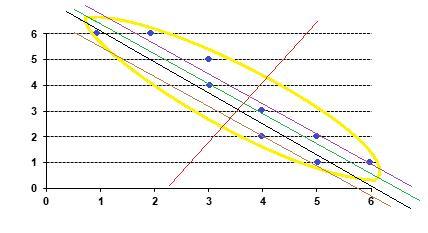 Из предложенных пяти прямых выберите линию тренда - ту прямую, которая наилучшим образом усредняет все изображенные точками значения.