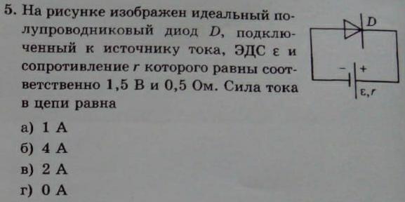 5. На рисунке изображен идеальный по- лупроводниковый диод D, подключенный к источнику тока, ЭДС е и сопротивление r которого равны соответственно 1,5 В и 0,5 Ом. Сила тока в цепи равна a) 1 A б) 4 A в) 2 A г) 0 A