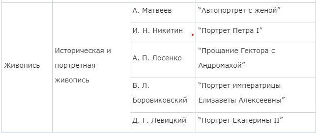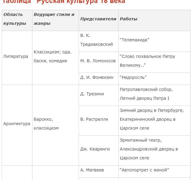 Культура России второй половины 18 века таблица (направление культуры, произведения (достижения), представители)