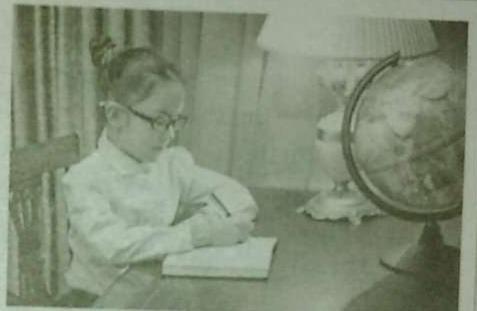 In the picture we can see a girl. This girl is very beautiful. She is wearing her glasses. I really like them. Right now she is writing something. I think she is doing her homework. On her desk we can see a book, a lamp and a globe.