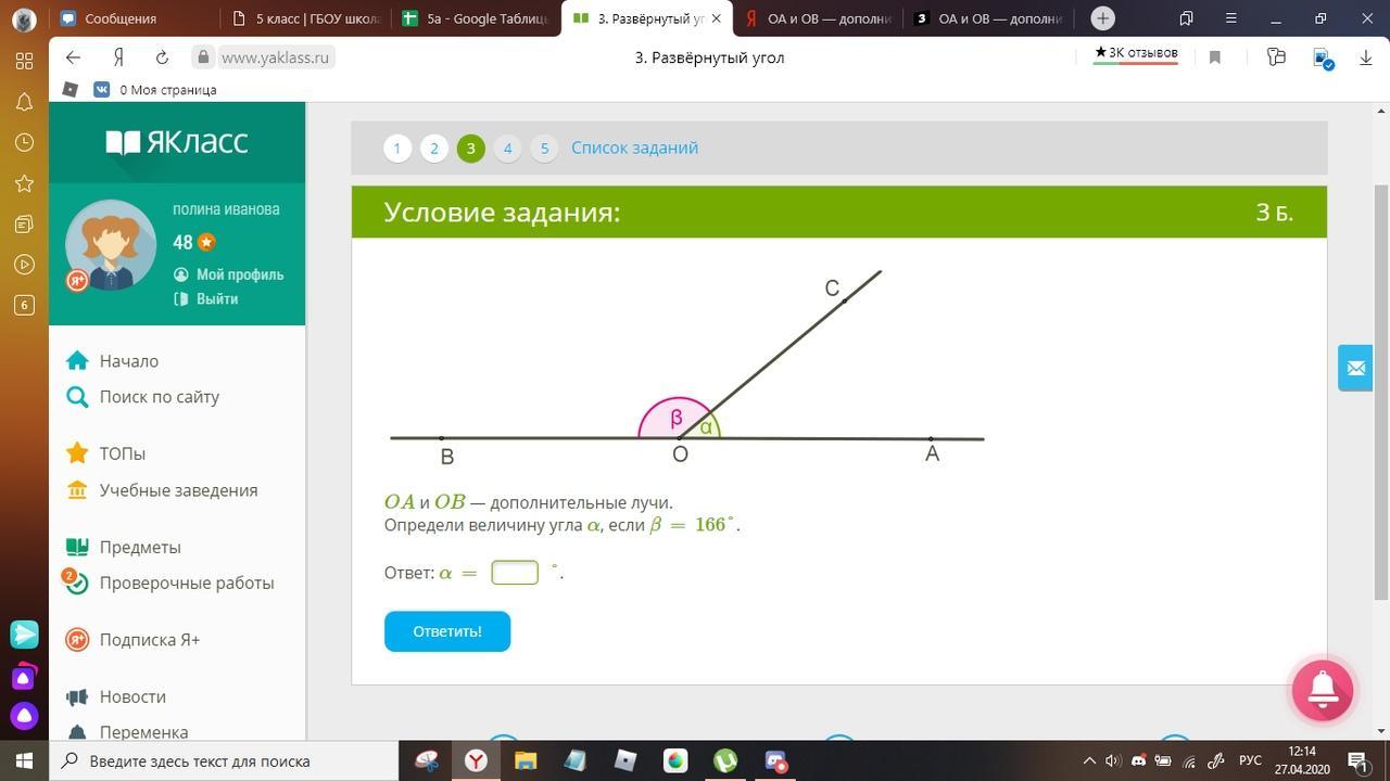 180-166=14 градусов. (угол α)