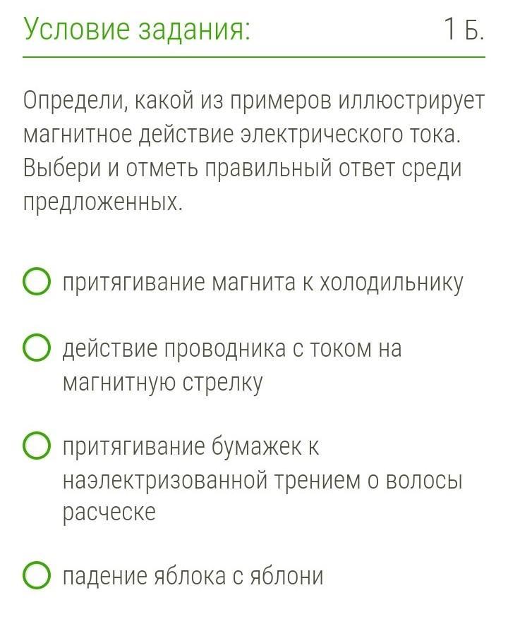 Определи, какой из примеров иллюстрирует магнитное действие электрического тока. Выбери и отметь правильный ответ среди предложенных.