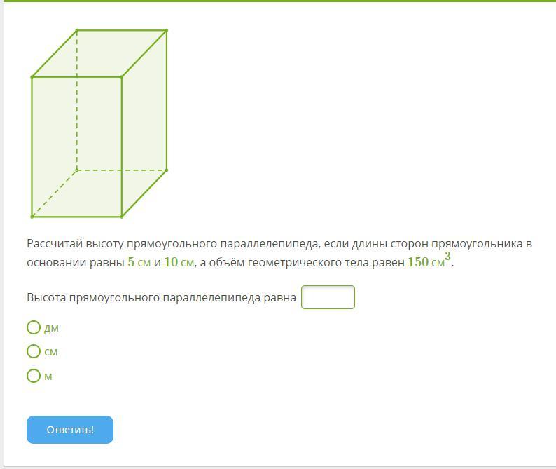 c = V / ab = 150 / 10*5 = 150 / 50 = 3 см - высота паралилепипеда