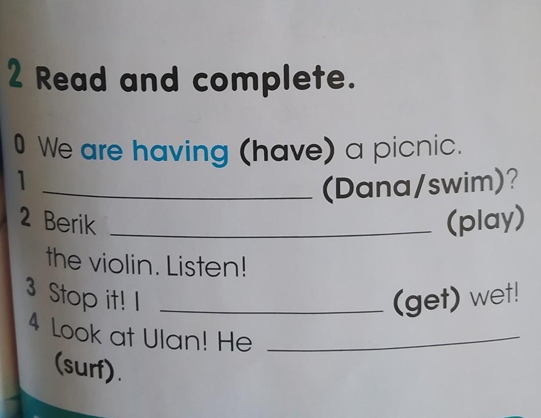 Is Dina swimming?, Berik Is playing violin. Listen. Stop it! I am getting wet! Look at Ulan! He Is surfing