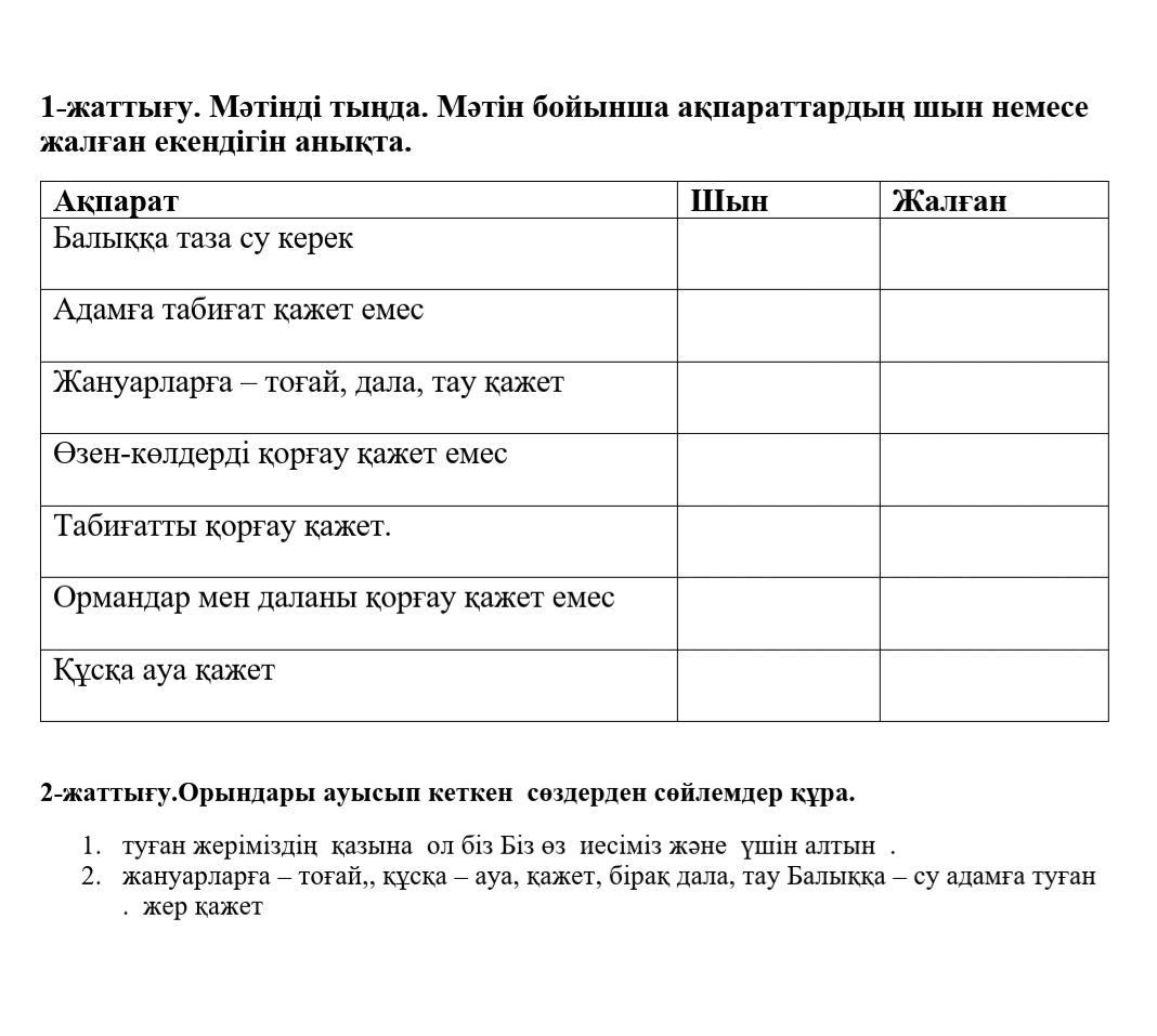 2) Балыққа-су,құсқа-ауа қажет, бірақ дала,тоғай,тау жануарларға,адамға туған жер қажет.