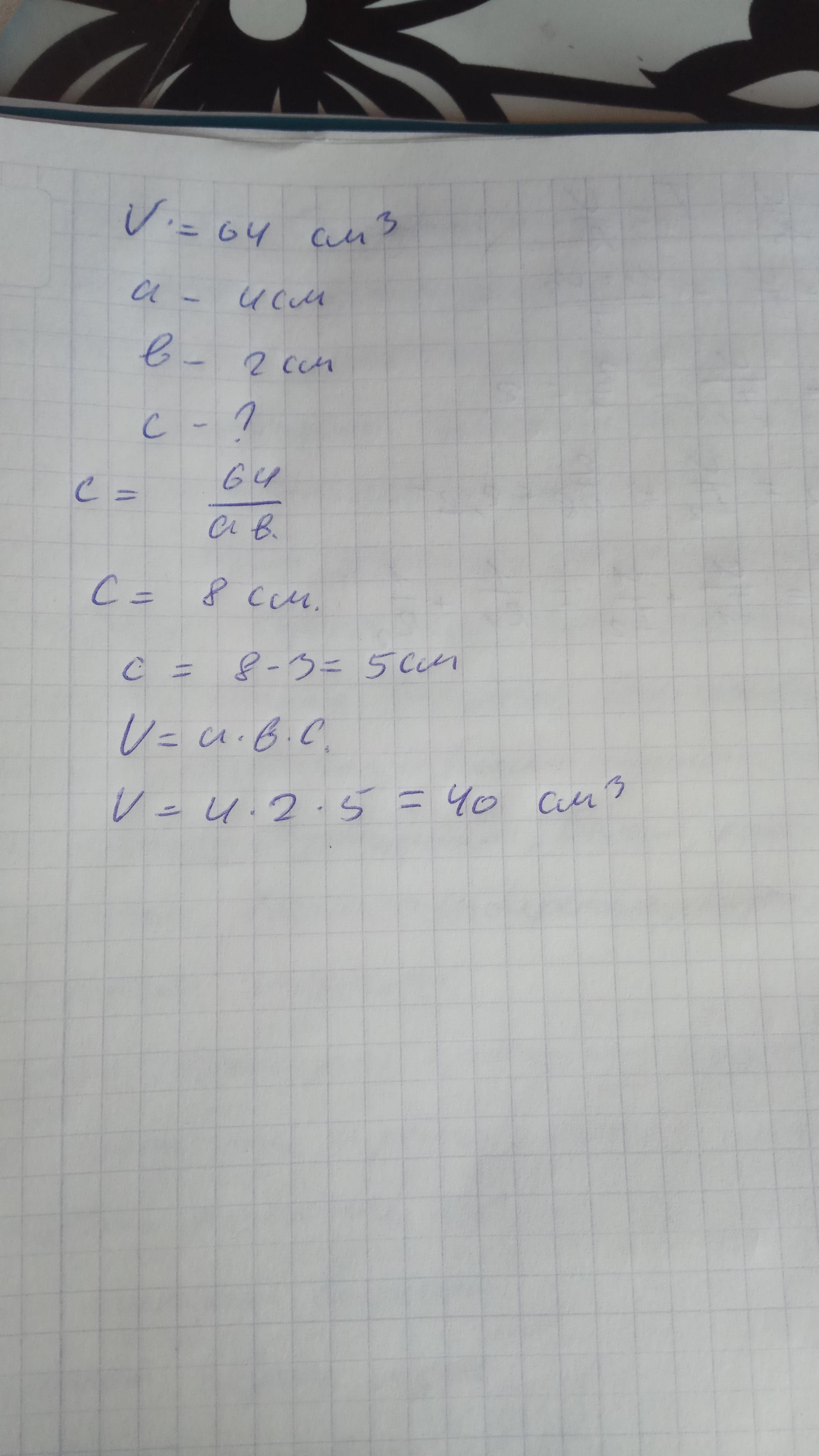 Найди объём фигуры объём параллелепипеда равен 64 см3 ширина равна 4 см высота 2 см длину этого параллелепипеда уменьшили на 3 см Определи объём получившегося параллелепипеда.