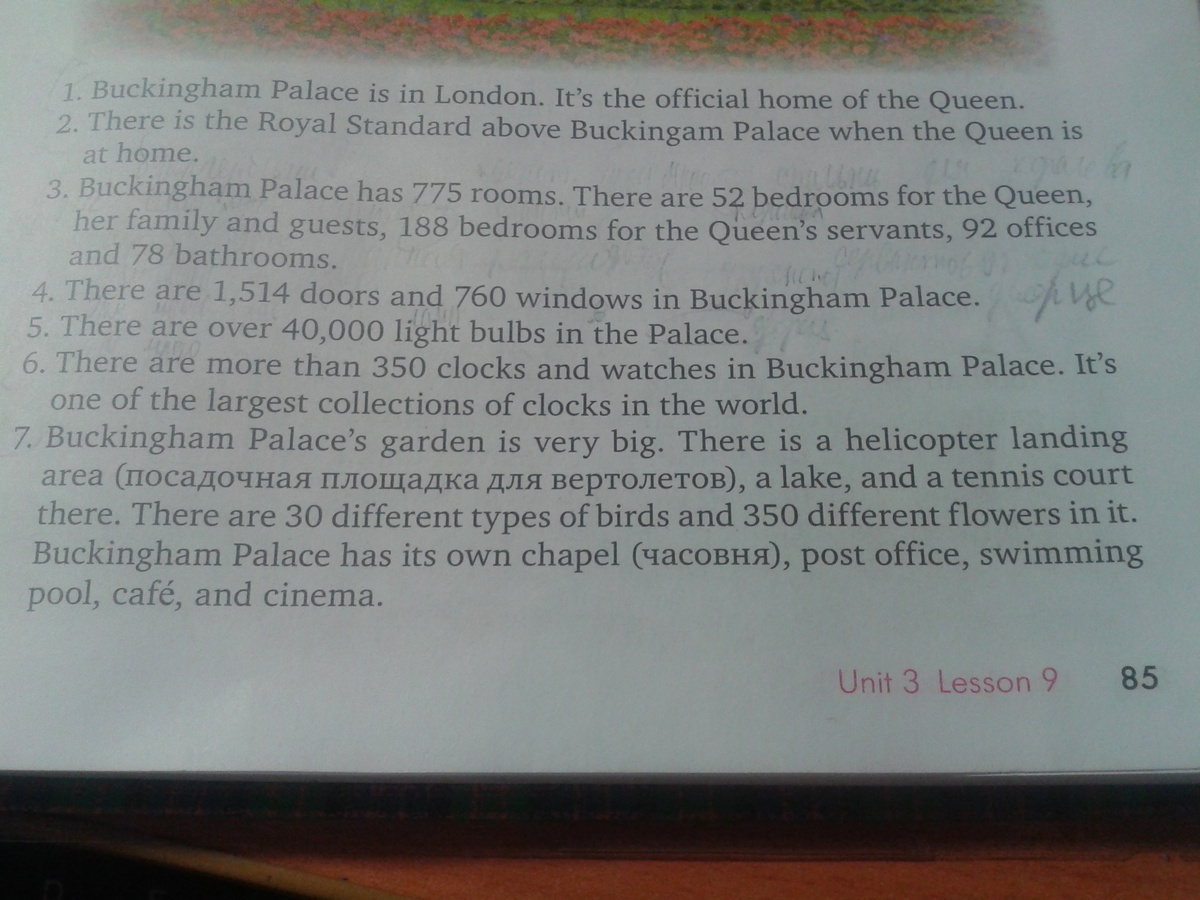 7)Букингемский сад очень большой.Здесь есть посадочная площадка для вертолётов,река, и теннисный корт.Здесь есть 30 различных типов птиц и 350 различных типов цветов в нём.Букингемский дворец имеет свою собственную часовню,почтовое отделение,плавательный бассейн,кафе и кинотеатр.