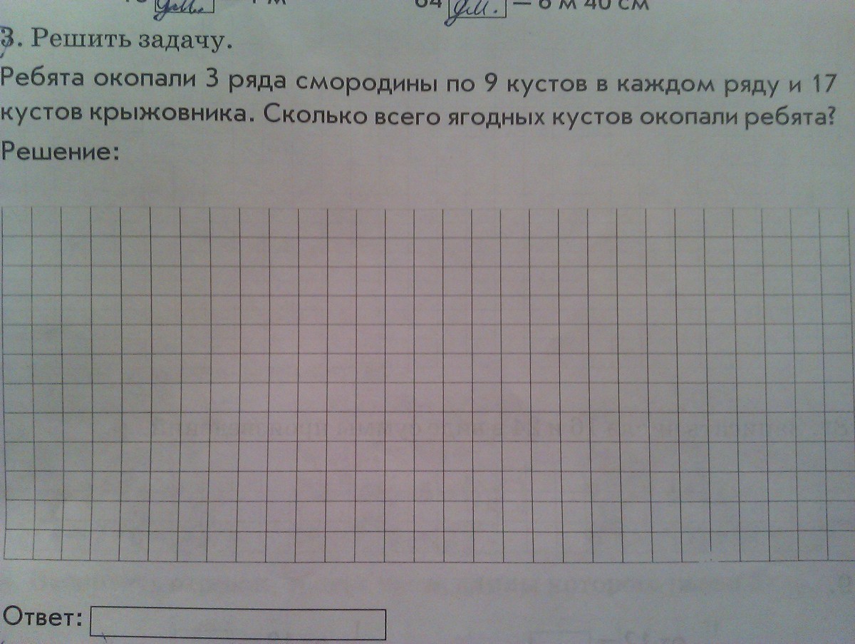 1)3*9=27 кустов смородина 2)27+17=44 ягодных кустов. Ответ:всего 44 ягодных кустов.