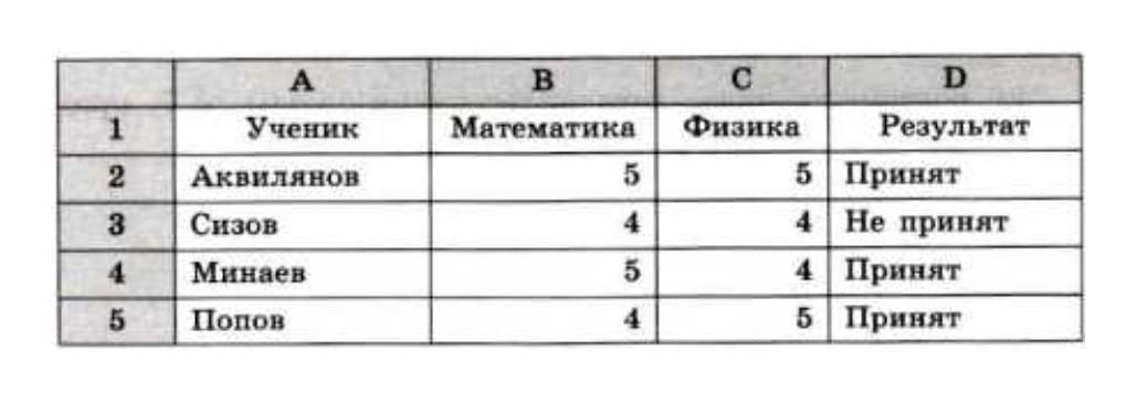 Рассмотрите фрагмент электронной таблицы с результатами приёма выпускников девятого класса в физико-математический класс: