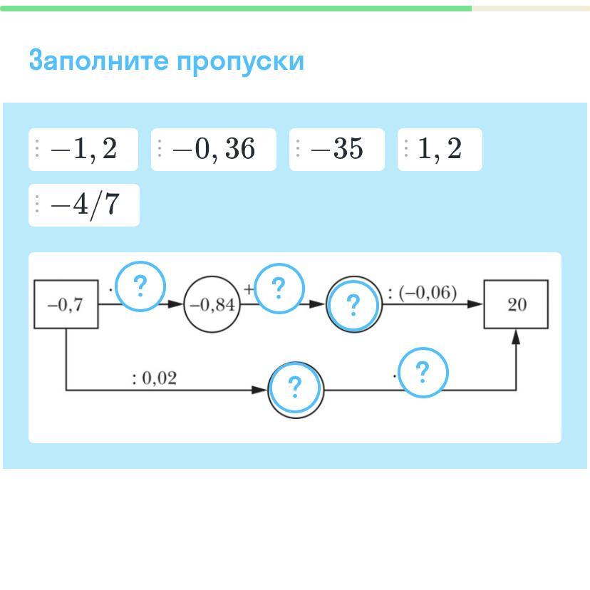 -0,7*1,2 → -0,84+(-0,36) → -1,2:(-0,06) → 20