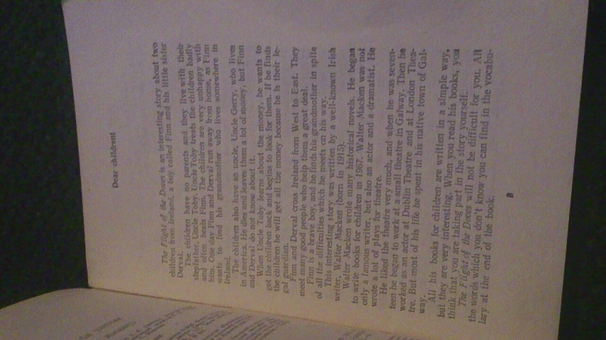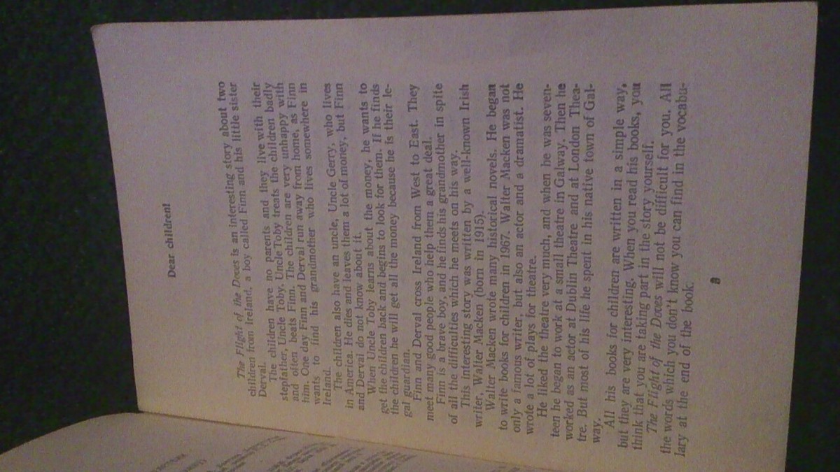 полет голубя история о 2детях из ирландии.Мальчика звали Финн и его маленькую сестру Дервал .У детей не было родителей и они жили с их отчимом дядей тоби.дядя тоби плохо обращался с детьми и постоянно бил Финна.дети были очень несчастны с ним в один день Финн и Дервал убежали из дома Финн хотел гаити их бабушку которая жила где-то в Ирландии.У них также был дядя,дядя Герри. который жил в америкеон умер и оставил им много денег но финн и дервал не знали об этом.(надо писать дальше или тебе уже перевели эту часть?)
