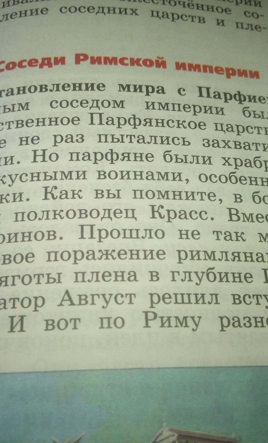 Установление мира с Парфирией.Разгром римских войск в Германии.Как жили германцы.Восточным соседом римлян было могущественное Парфянское царство, которое не раз пытались захватить римляне. Но парфяне были храбрыми и искусными воинами.По повелению Августа римские легионы переправились через реку Рейн и подчинили живших там германцев. Они дали им землю для работы. Таких людей стали называть колоны