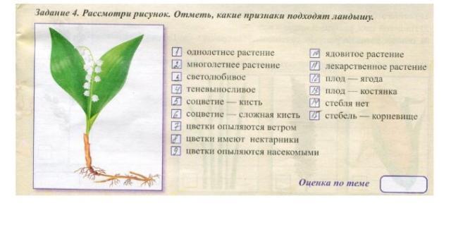Рассмотри рисунок.Отметь какие признаки подходят ландышу.