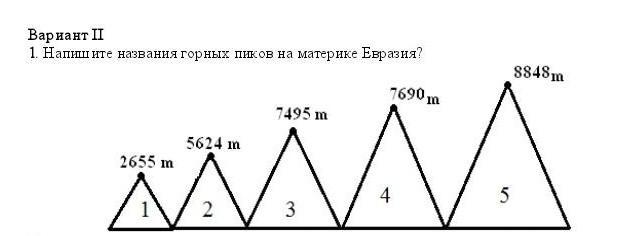 1 - 2655 метров , 2 - 5624 метров , 3 - 7495 метров , 4 - 7690 метров , 5 - 8848 метров .