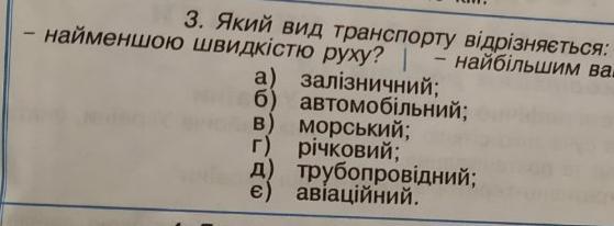 Який вид транспорту відрізняється найменшою швидкістю руху?Варіанти відповіді на фото.