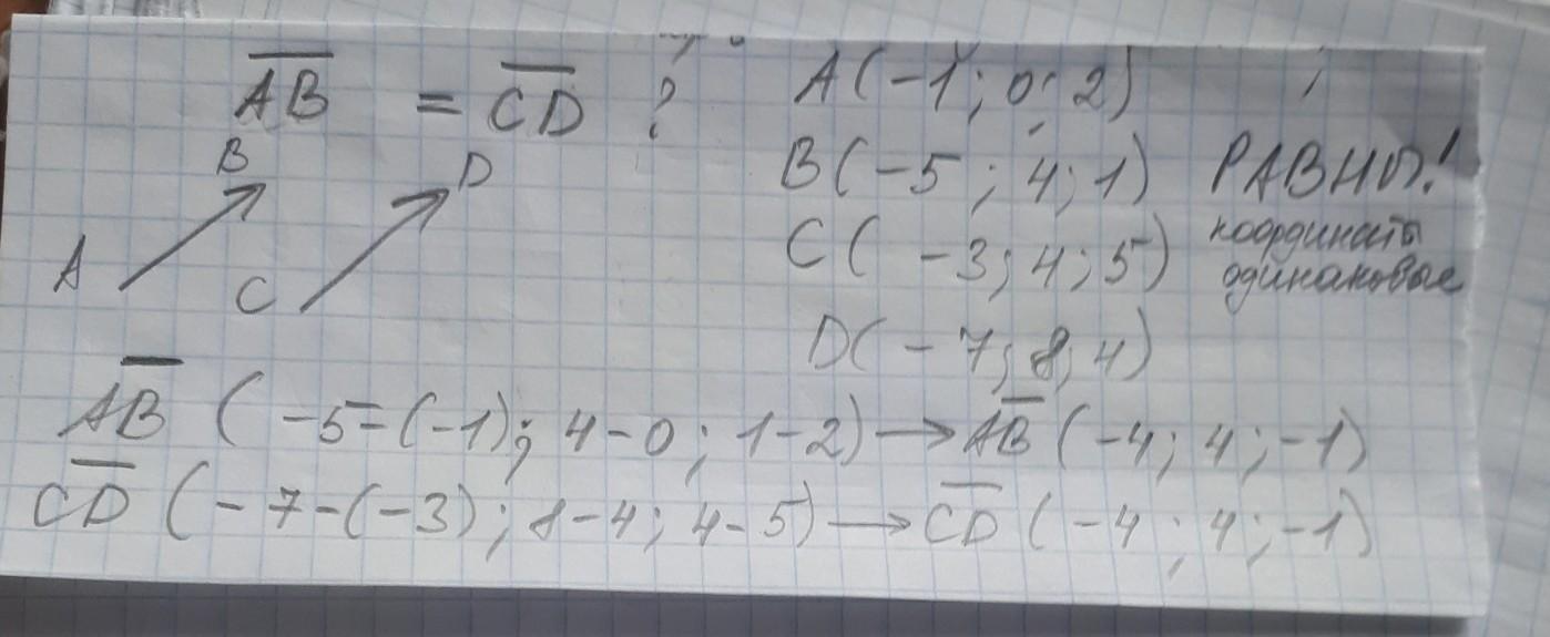 Даны координаты точек a b c d равны ли векторы ab и cd если A(-1;0;2) B(-5;4;1) C(-3;4;5) D(-7;8;4) Срочно нужна помощь пожалуйста!!!!!!