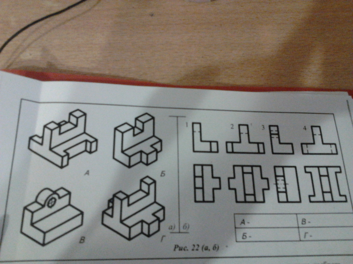 УПРАЖНЕНИЕ 13 ОПРЕДЕЛИТЬ КАКИЕ ЧЕРТЕЖИ (1-4) СООТВЕСТВУЮТ НАГЛЯДНЫМ ИЗОБРАЖЕНИЯМ ДЕТАЛЕЙ ( А-Г ). Запись и ответ в таблице(рис. 22 )