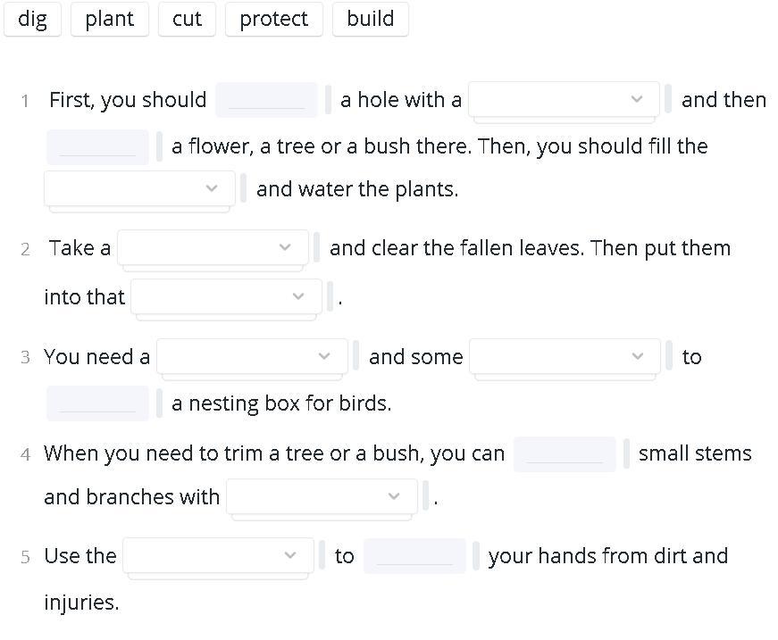 1) dig , 2) spade , 3) plant 4) watering can .