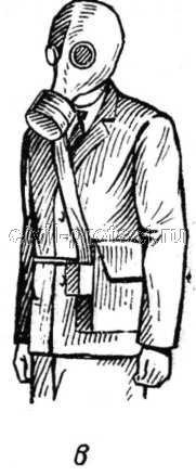 В «походном» положении противогаз находится у взрослых на левом боку, а у детей или на правом боку, или на груди.