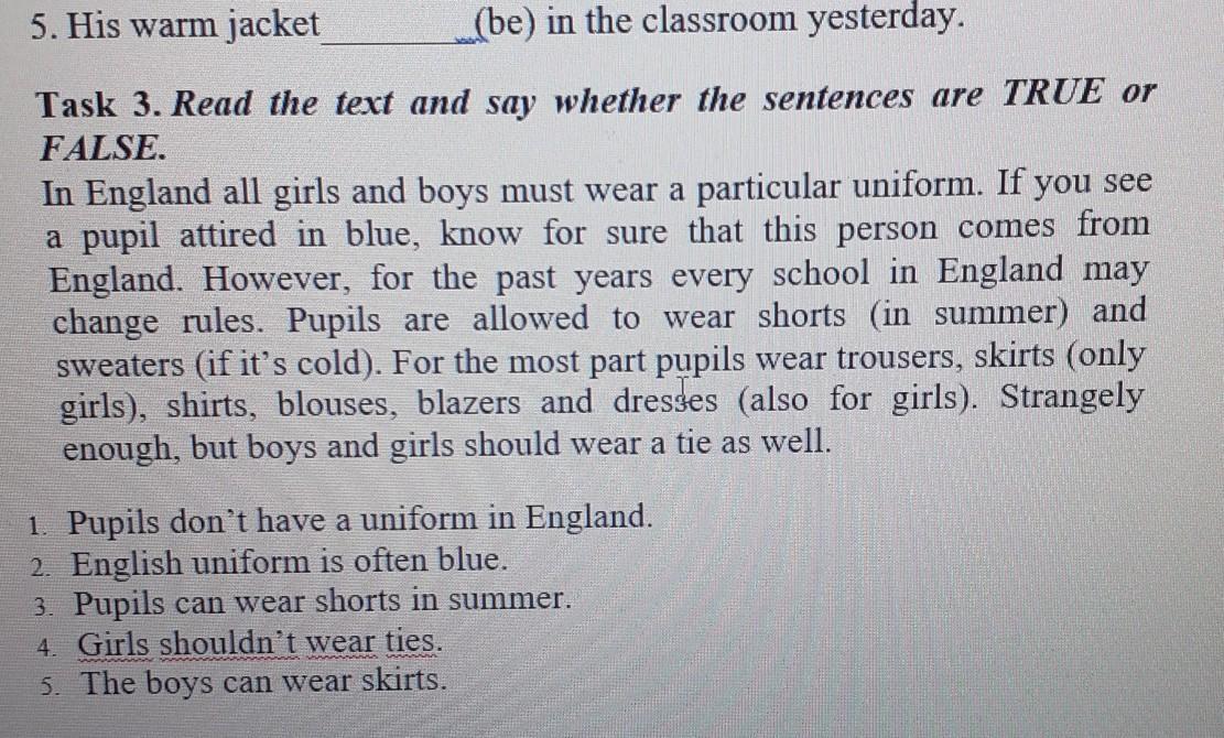 1) false (In England all girls and boys must wear a particular uniform.)