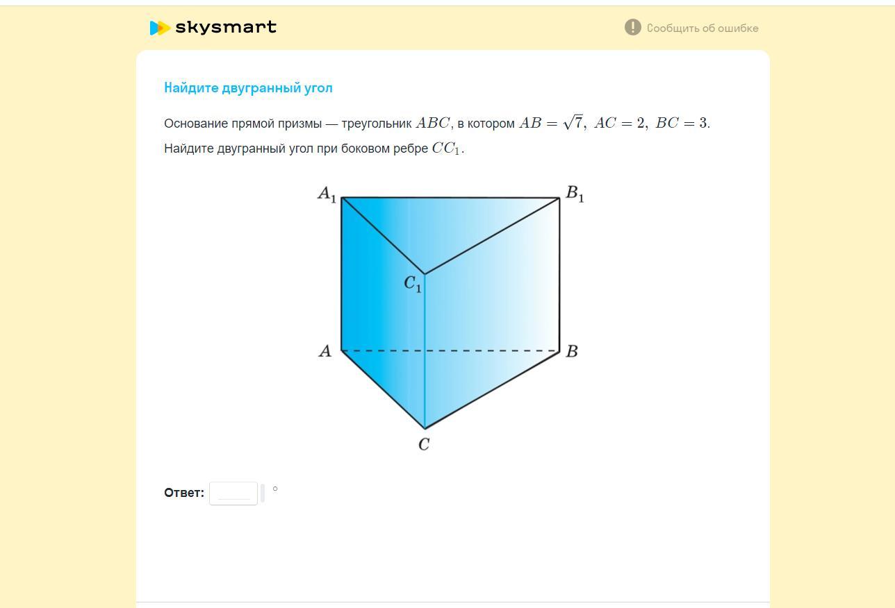 Основание прямой призмы треугольник АВС. АВ=корень из 7, ВС=3, АС=2. Найти двугранный угол при боковом ребре СС1.