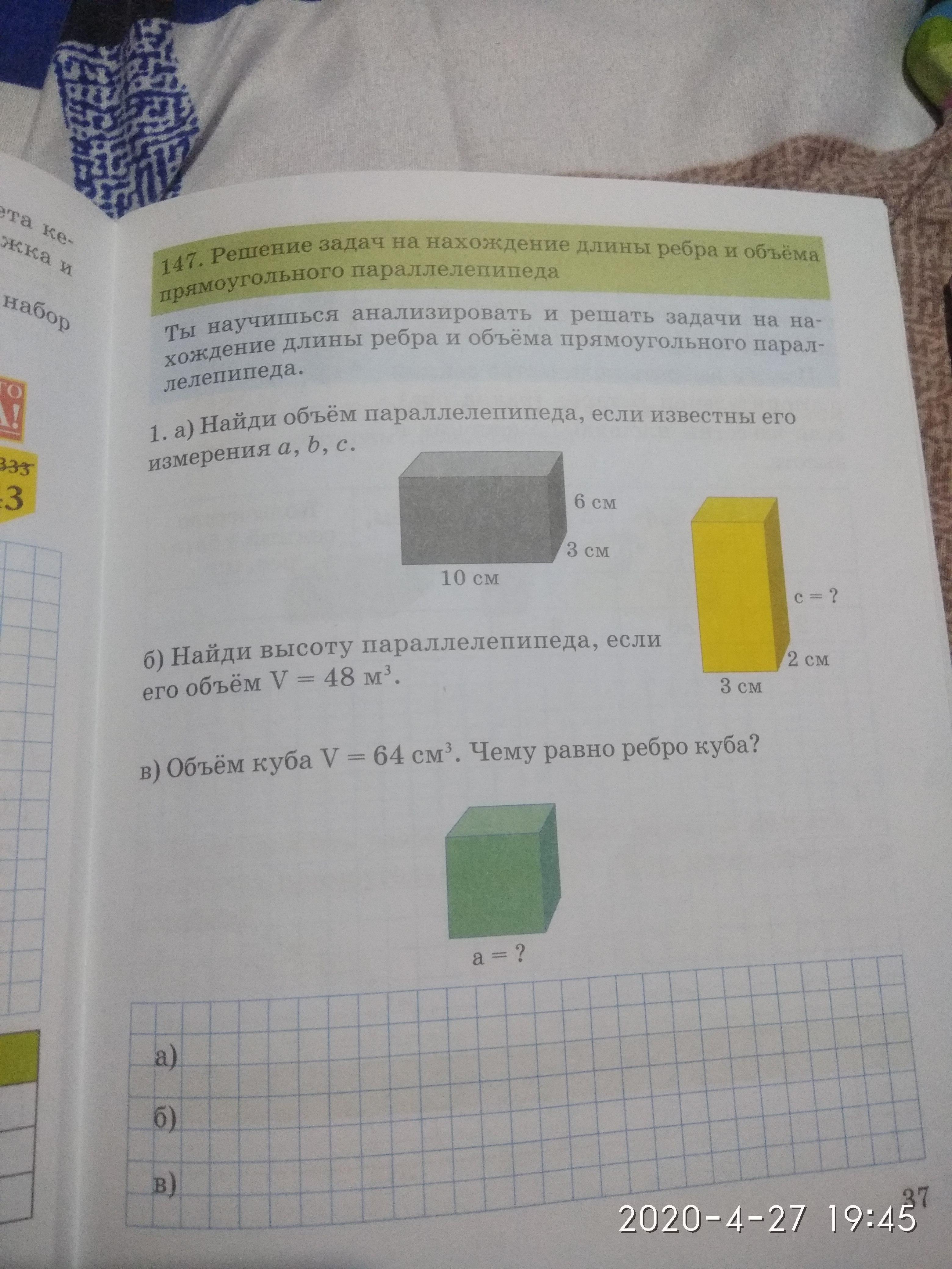 в) Vкуба=а^3, следовательно а=4см(4*4*4=64)