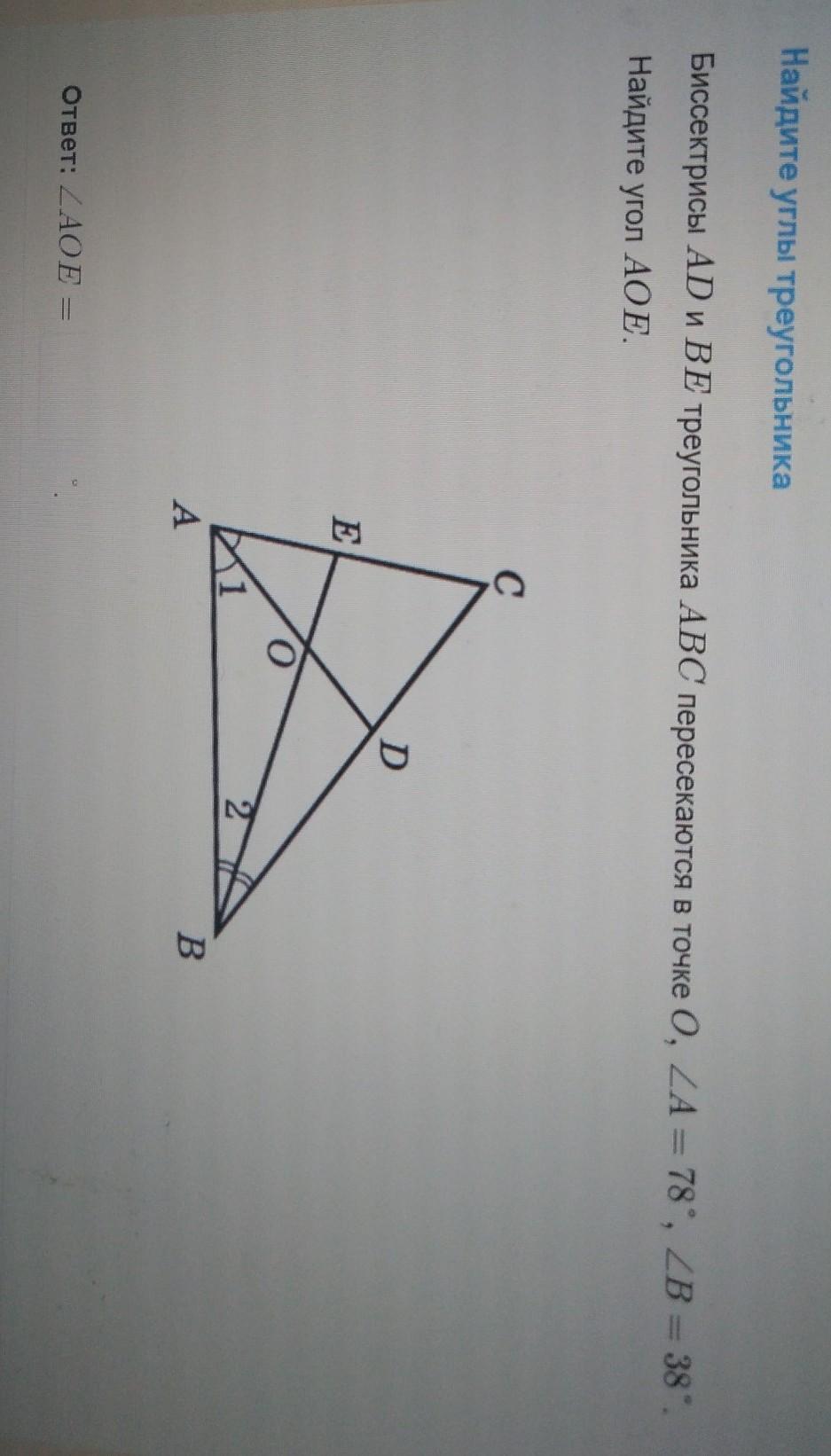 Биссектрисы AD и BE Треугольника ABC пересекаются в точке О, угол A=78°,угол В =38°.
