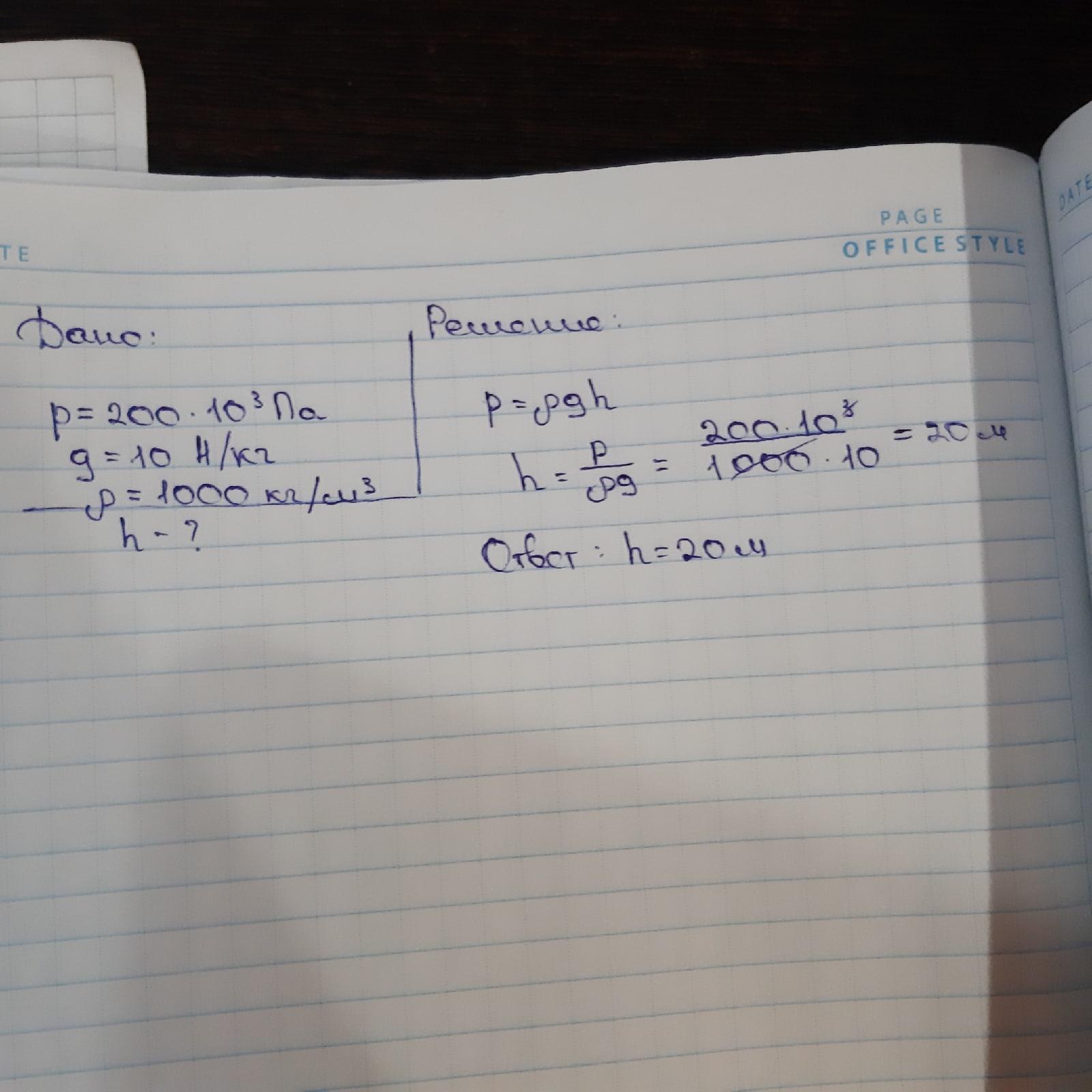 Решите пожалуйста задачу Тиск води в найнижчій точці греблі дорівнює 200 кПа. Визначте висоту греблі. Вважайте, що g=10 H/кг. Густина води 1000 кг/м3