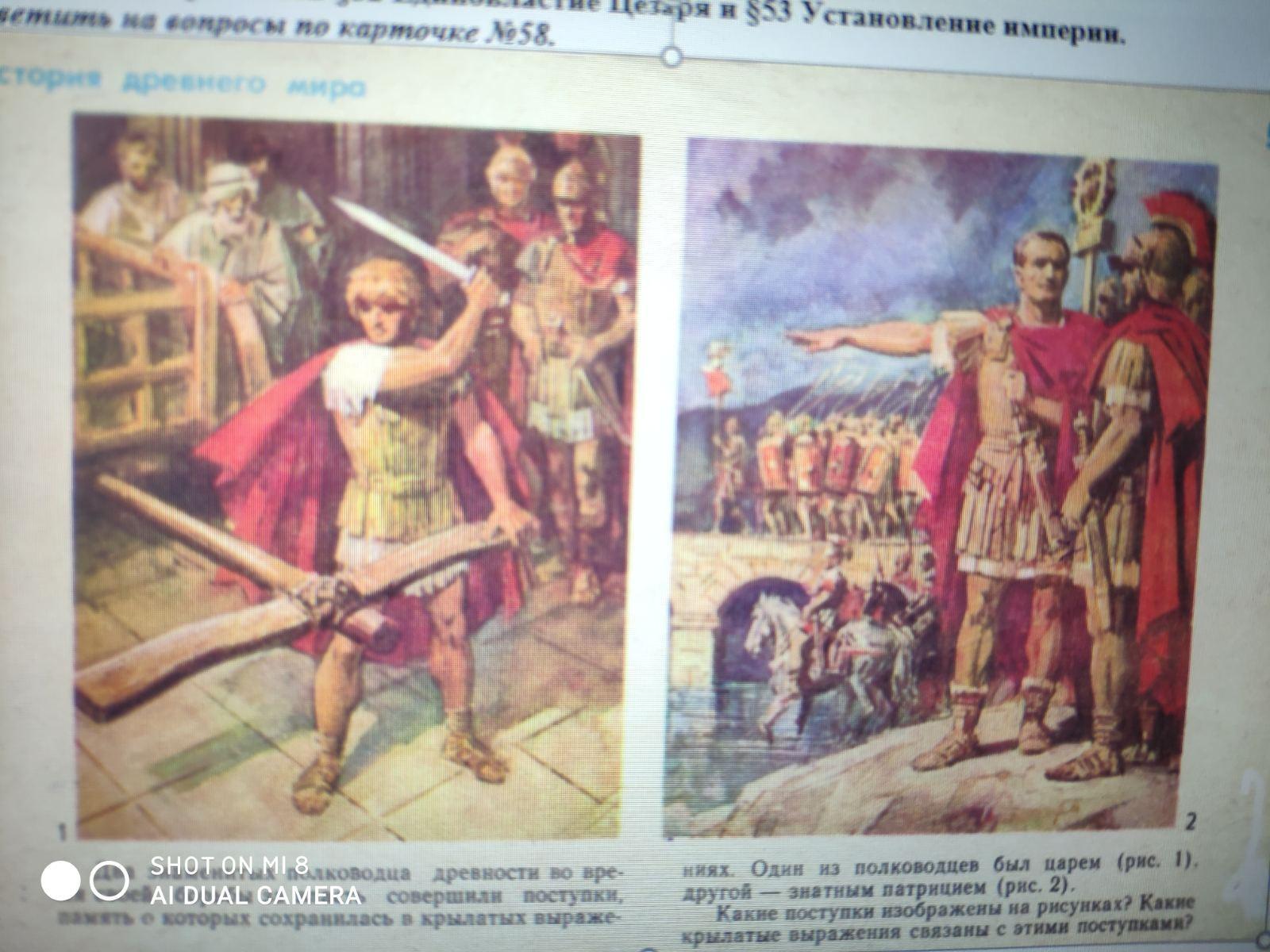 Два знаменитых полководца древности во время своей борьбы совершили поступки, память о которых сохранилась в крылатых выражениях. Один из полководцев был царем другой знатным патрицием . Какие крылатые выражения связаны с этими поступками . (история древнего мира рисунок 58)