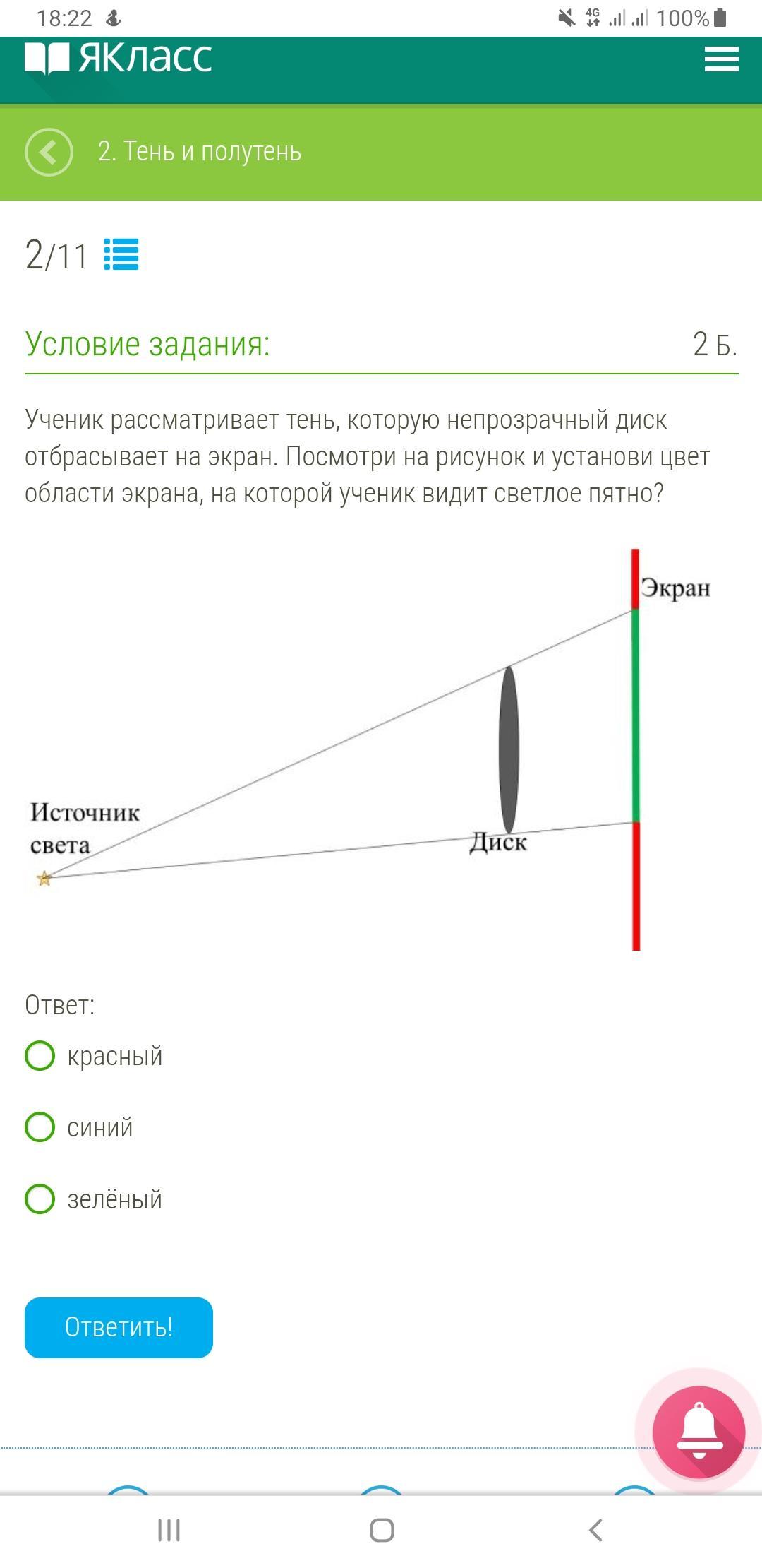 Ученик рассматривает тень, которую непрозрачный диск отбрасывает на экран. Посмотри на рисунок и установи цвет области экрана, на которой ученик видит светлое пятно?