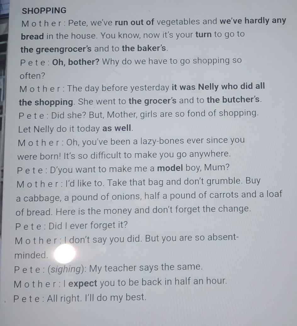 Мама: Пит, в нас дома нет овощей и хлеба! Знаешь, сейчас твоя очередь сходить в овощной магазин и в пекарню.