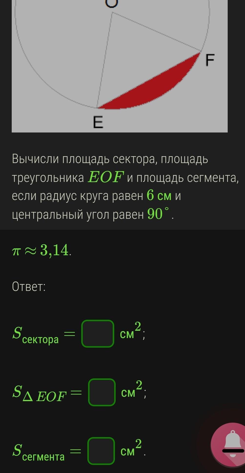 S(тр.)=1/2a*b, (<FOE=90, OE=OF=R=6), S(тр)=1/2*6*6=18(см^2)