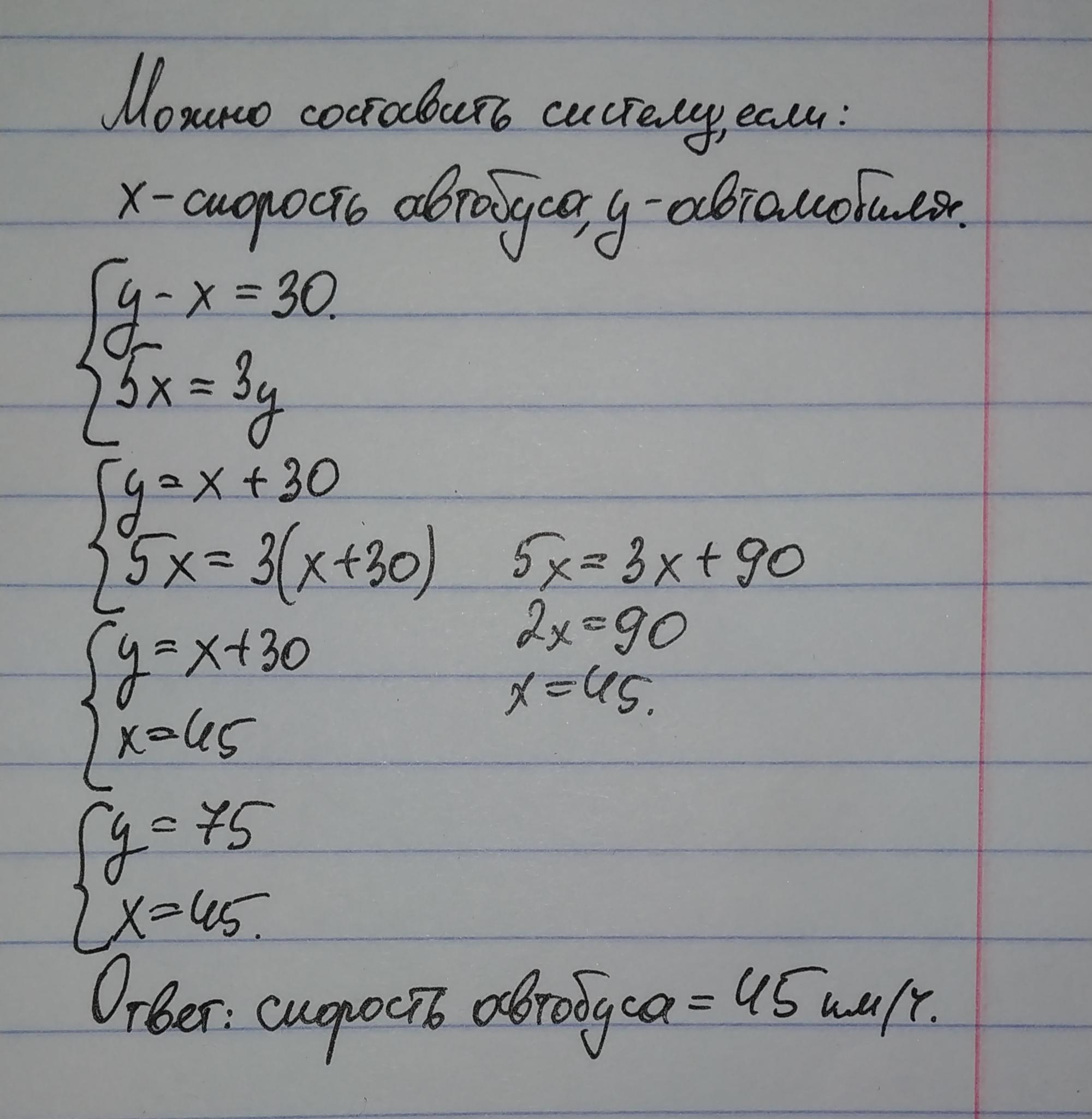 скорость автобуса на 30 км ч меньше скорости легкового автомобиля . Автобус за 5 ч проходит такой же путь, как легковой автомобиль за 3 ч. Найдите скорость автобуса?