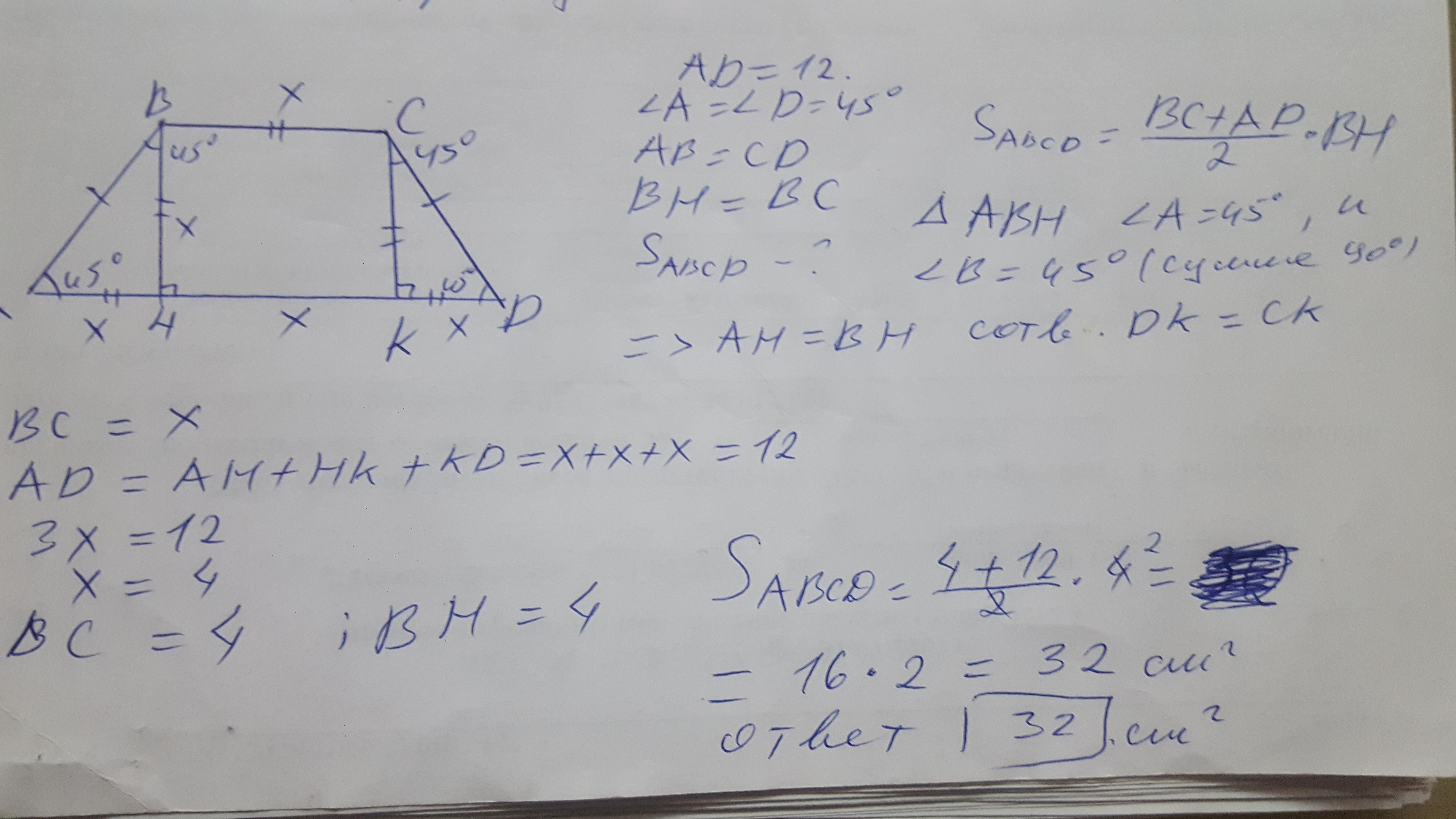 В равнобедренной трапеции угол при основание равен 45° ,а высота равна меньшему основанию.Найдите площадь трапеции ,если больше основание равно 12 см. С решением пожаааааалуйстааа