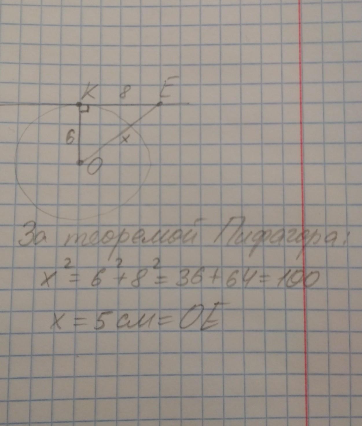ОК перпендикулярна КЕ так как прямая КЕ касается окружности. За теоремой Пифагора: х2=36+64. х2=100; х=10