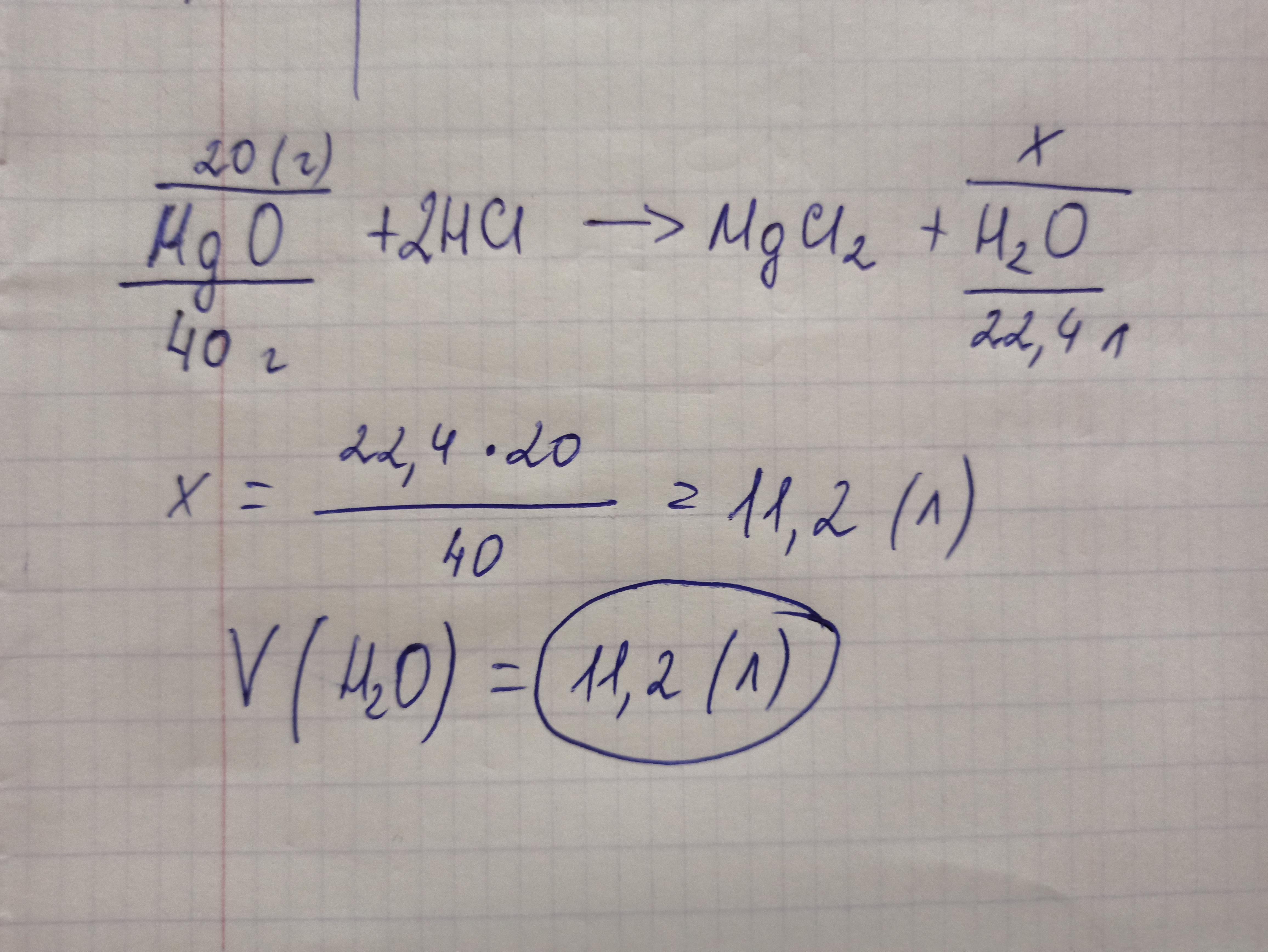 СРОЧНО!!!! Який об’єм води (н. у.) утвориться під час взаємодії 20 г магній оксиду з хлоридною кислотою?