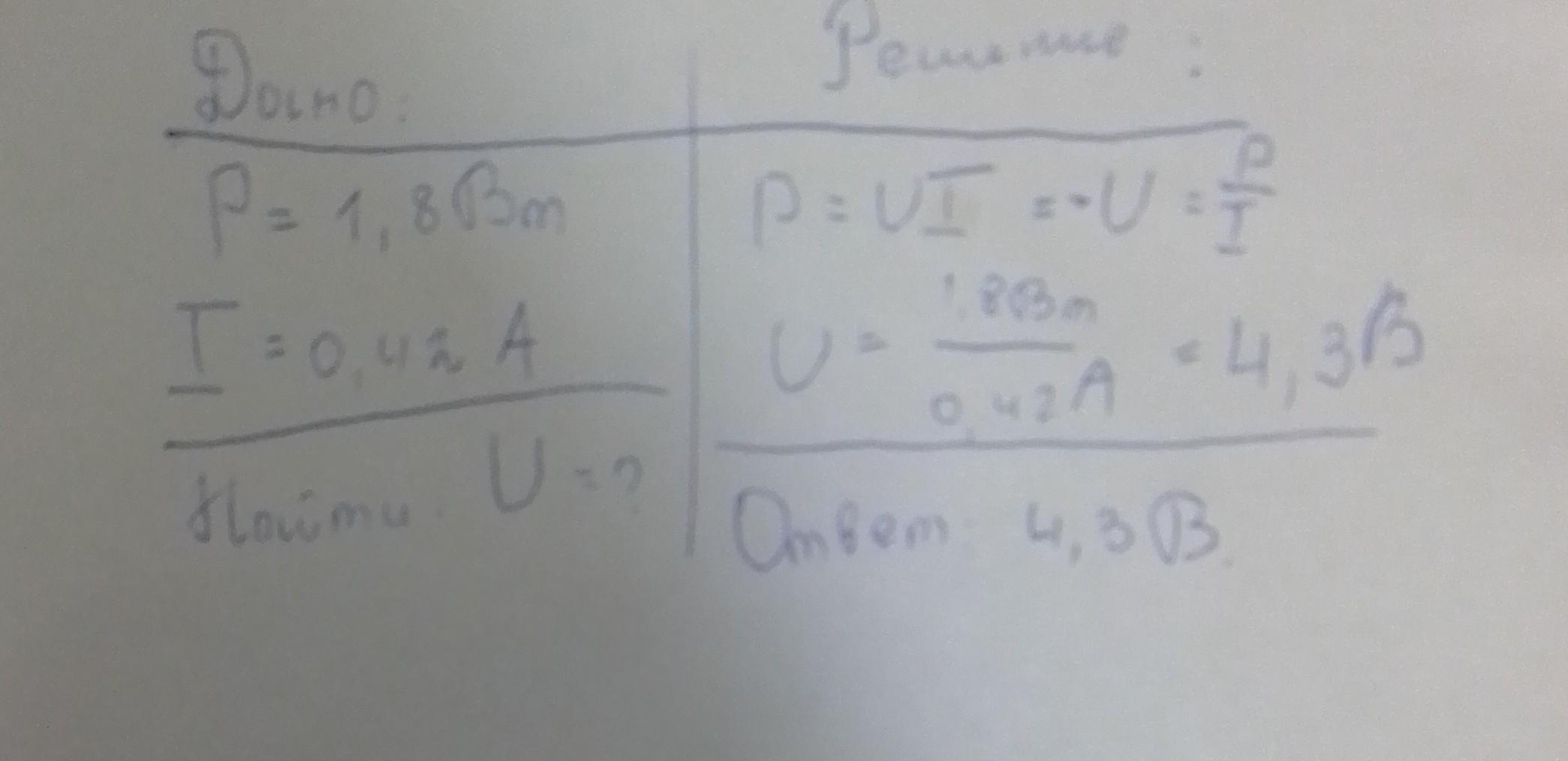 Мощность электрического карманного фонарика равна 1,8 Вт. Найди напряжение батарейки, если через лампочку протекает ток силой 0,42 A.
