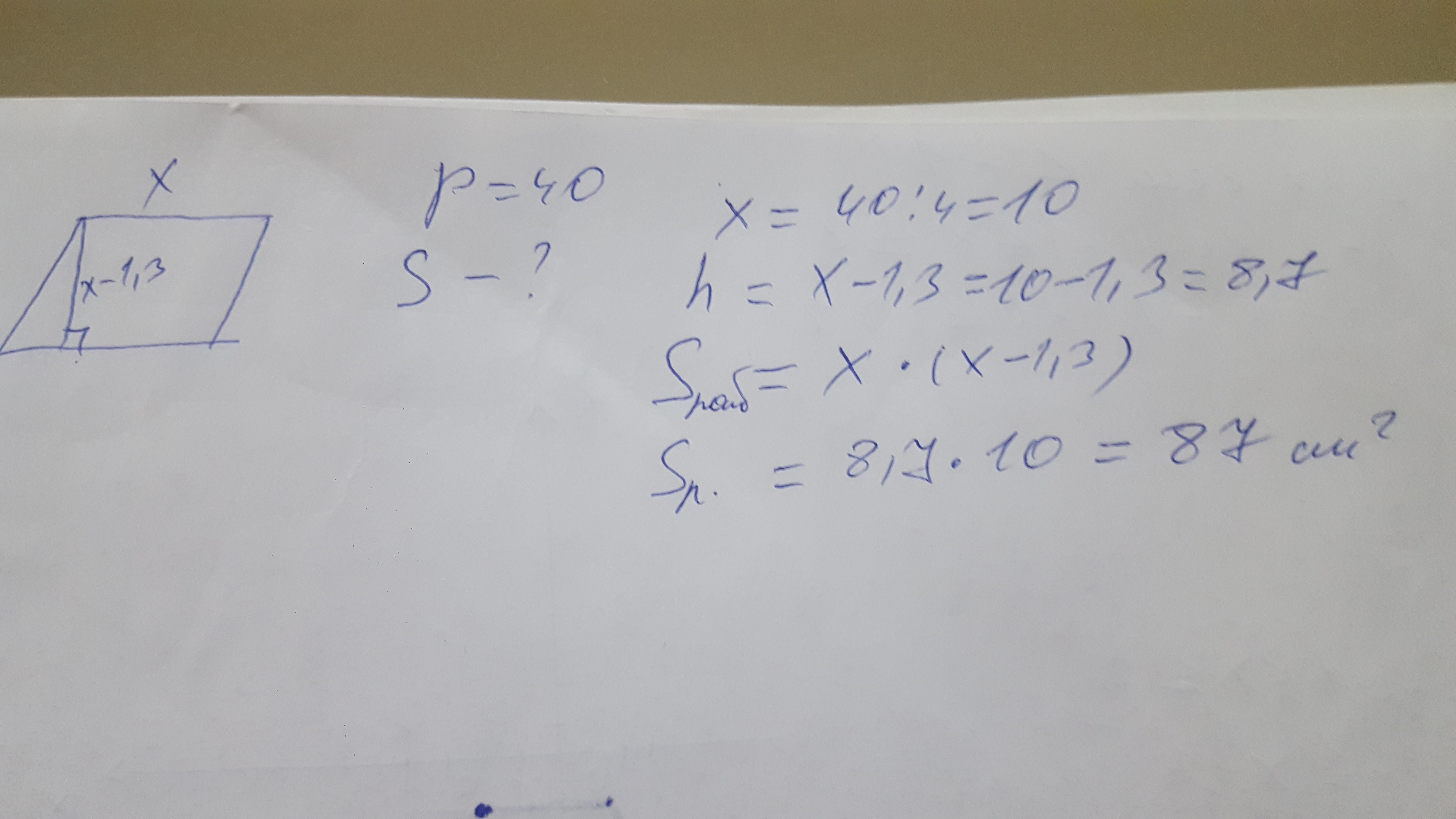 Высота ромба на 1,3 см меньше, чем его сторона. Периметр ромба равен 40 см. Вычисли площадь ромба.