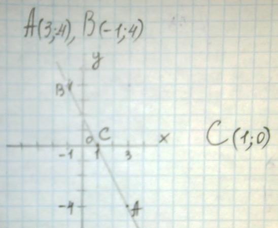 Итак, известны точки: А(3; -4), В(-1; 4). Найдя их координаты, мы соединим их и получим отрезок АВ. Он пересекает ось абцисс (х) в точке С, координаты которой (1;0).