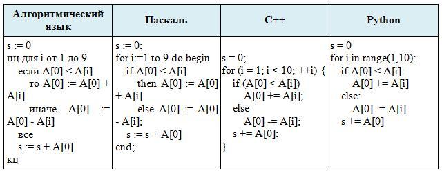 Представленный ниже на четырех языках программирования фрагмент программы обрабатывает элементы одномерного целочисленного массива A с индексами от 0 до 9. Перед началом выполнения данного фрагмента эти элементы массива имели значения 2, 4, 6, 1, 7, 2, 3, 6, 7, 2 (т. е. A[0] = 2, A[1] = 4, …, A[9] = 2). Определите значение переменной s после выполнения фрагмента.