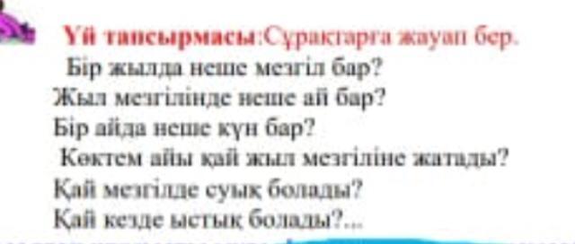 Бір жылда 4 мезгіл бар.Жыл мезгілінде 12 ай бар.Бір айда 30,31 кейде 28 күнде бар.Көктем айы көктем жыл мезгіліне жатады.Қыс мезгілінде суық болады.Ал жазда ыстық болады.