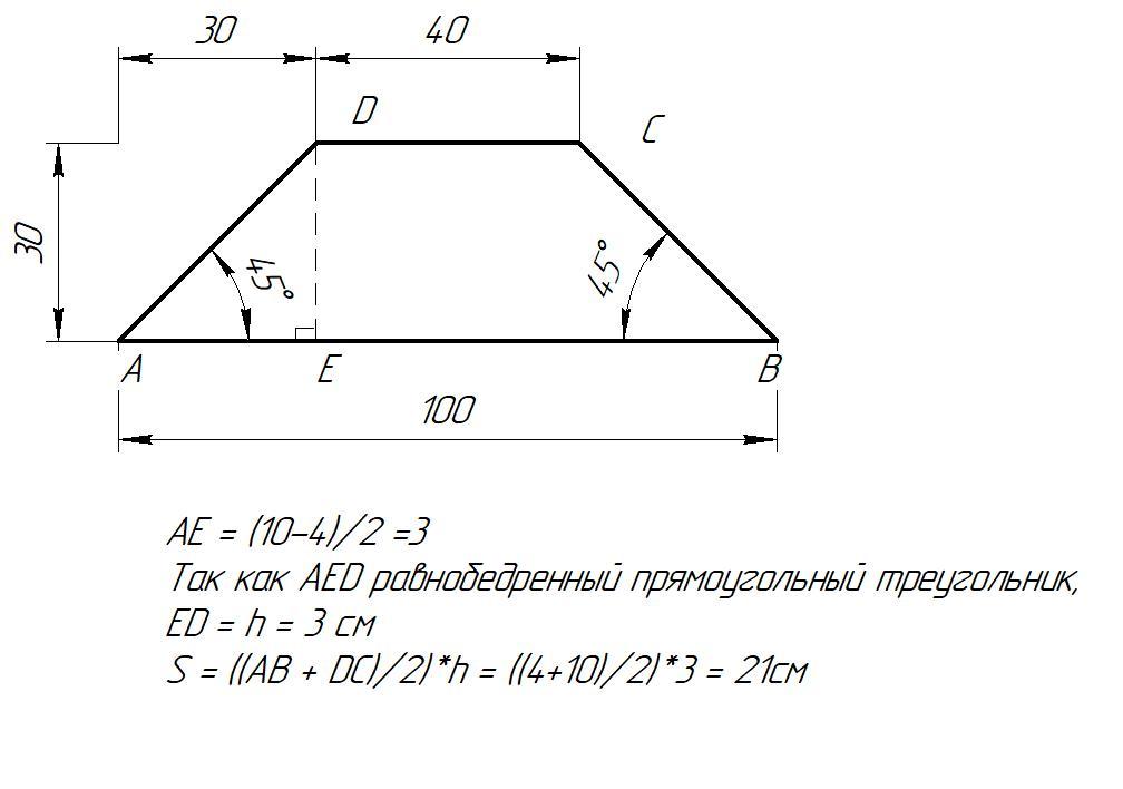 Найдите площадь равнобедренной трапеции, если ее основания равны 4 см и 10 см , а острый угол 45◦.