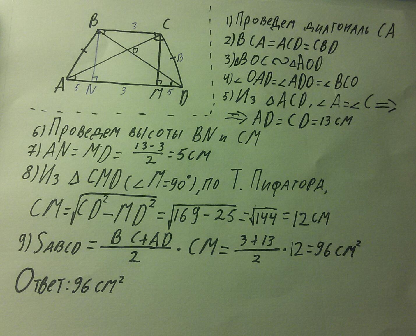 ПОЖАЛУЙСТА,ОЧЕНЬ НУЖНО.Основания равнобокой трапеции равны 3 и 13 см,а диагональ делит тупой угол пополам.Найти площадь трапеции